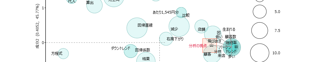 テキストマイニングイメージ 対応分析とは 分析ツール:KHcoder 対応分析とは、数量化理論Ⅲ類の分析手法でコレスポンデス分析でありまして、主成分分析との違いは・・・とにかく説明が難しいです。「言う…